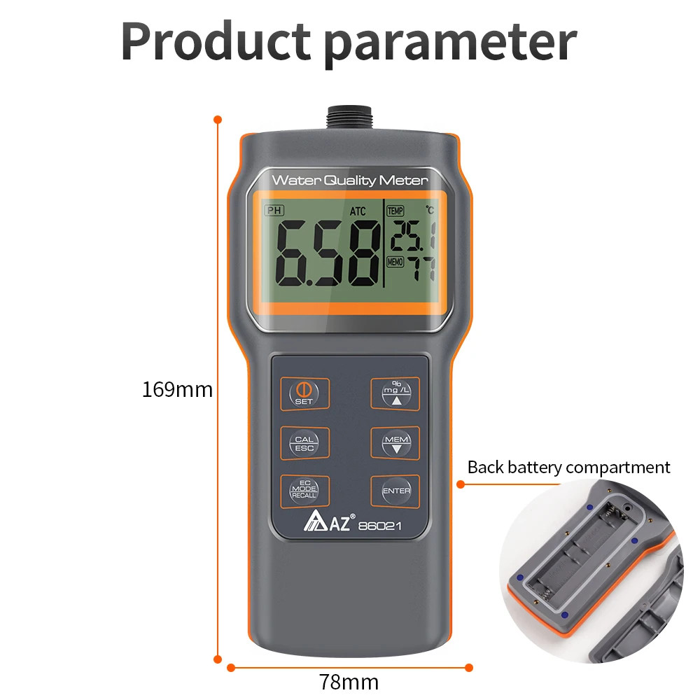 AZ Instrument รุ่น AZ86021-DO เครื่องวัดค่าออกซิเจนในน้ำแบบพกพาภาคสนามสายวัดยาว 3เมตร แสดงผลการวัดบนจอ LCD (แสดงผลทั้งค่า DO และ Temperature) ให้ผลลัพธ์ที่รวดเร็วและแม่นยำ ให้ผลลัพธ์ที่รวดเร็วและแม่นยำด้วยการชดเชยอุณหภูมิอัตโนมัติ (ATC) ที่จะรองรับความแตกต่างของอุณหภูมิที่เป็นธรรมชาติที่เกิดขึ้น