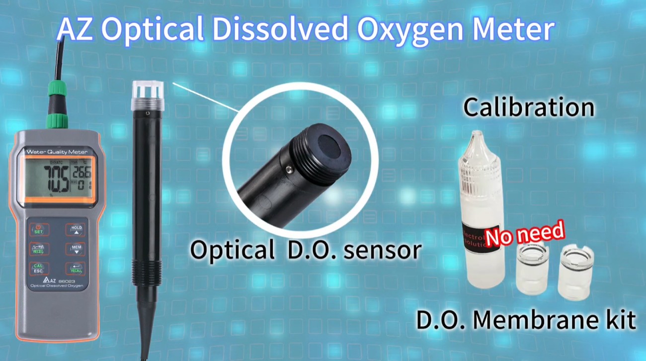 AZ86032 มีหัววัด DO แบบแสง (ODO; Optical Dissolved Oxygen) ที่ถูกออกแบบมาสำหรับวัดค่าในสภาพแวดล้อมที่มีออกซิเจนต่ำ ทนต่อก๊าซฤทธิ์กัดกร่อน ไม่ต้องใช้เวลาในการโพลาไรซ์ และการบำรุงรักษาต่ำ สำหรับการใช้งานในการตรวจสอบสิ่งแวดล้อม การเพาะเลี้ยงสัตว์น้ำ การบำบัดน้ำเสีย หรือการวิจัยทางวิทยาศาสตร์ เป็นต้น