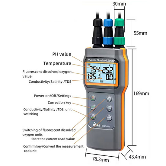 AZ86032 เครื่องวัด 6 in 1 แบบ Optical DO/pH/COND./SALT/TDS/Temp. มีย่านวัด pH: 2.00 ~ 12.00, Temp: -5.0~60.0℃, EC: 0 ~ 150.0 mS/cm (เปลี่ยนหน่วย us/cm ไปเป็น mS/cm อัตโนมัติตามช่วงการวัด), TDS: 0 ~ 150.0 ppt, Salinity: 0 ~ 42.0 ppt และ DO: 0.0~20.0mg/L